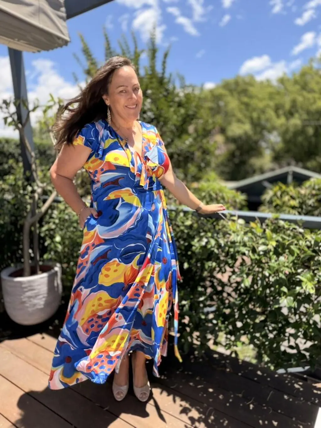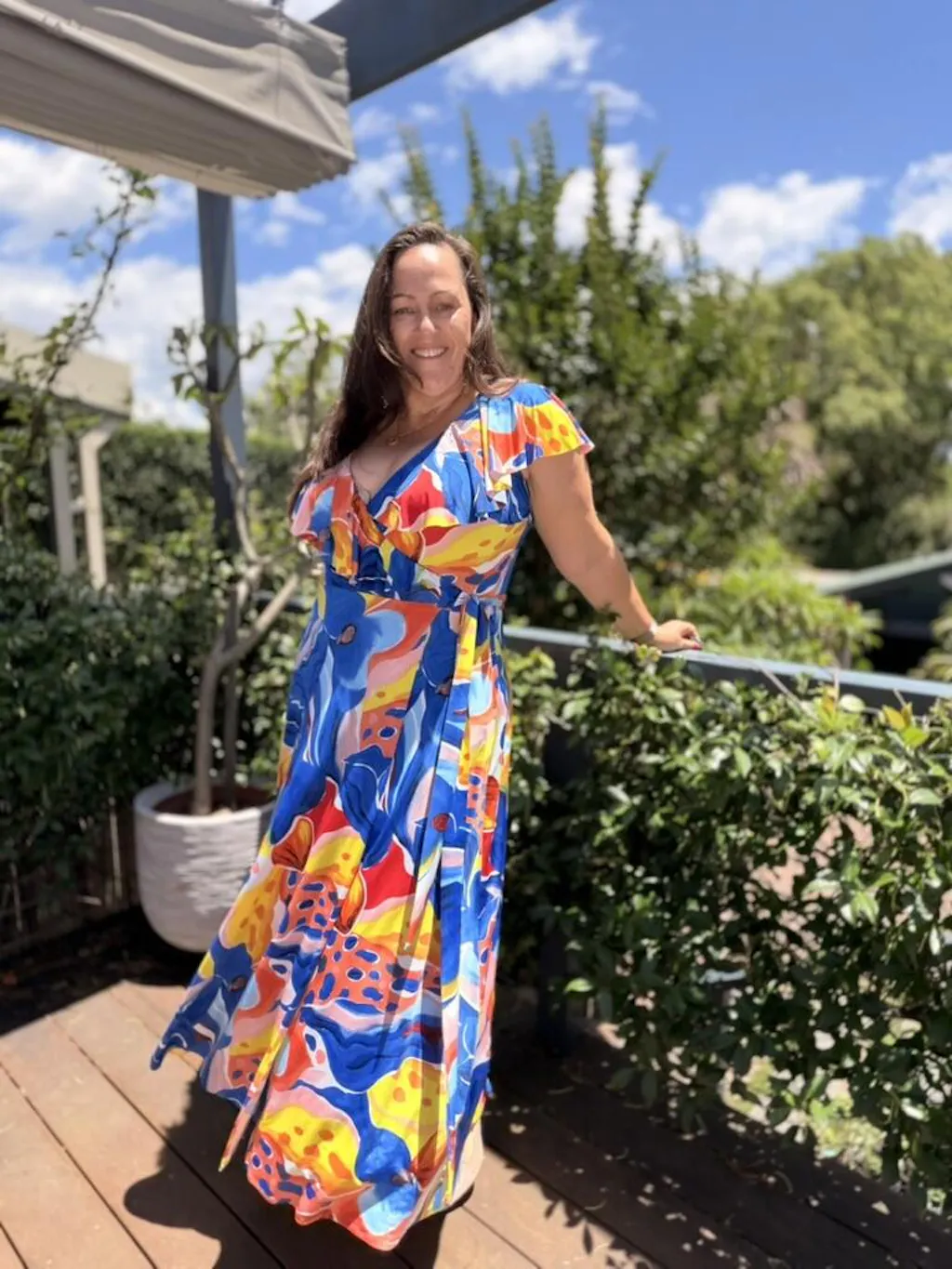 Crafted from cool-touch, slinky jersey, the Elle Maxi Wrap Dress in Summer Bliss flatters with its wrap silhouette and tie waist. A laser-cut raw edge frill adds lightness and modern detail, while pockets and a double-layered back bring comfort. Finished in an abstract floral print, it’s perfect for summer festivals, parties, and breezy occasions.