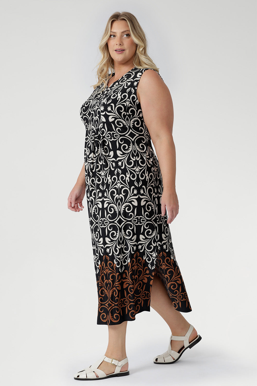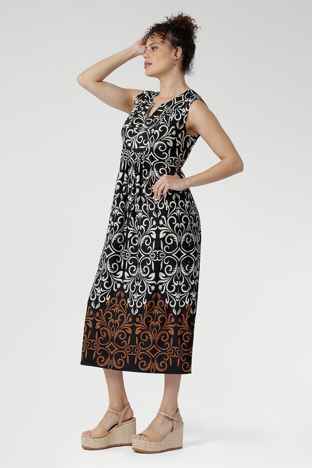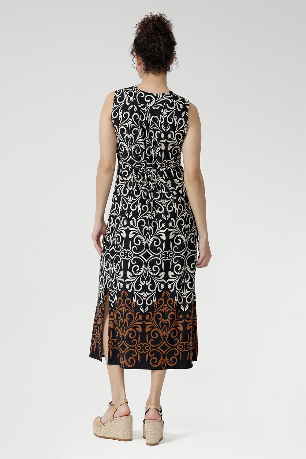 Crafted from slinky stretch jersey, the Fernanda Dress in Borderline features a sleeveless silhouette with waist ties, pleat detailing, and side splits. Showcasing a bronze and ivory placement print on black, this lightweight midi is perfect for summer getaways, evenings, and warm-weather ease.