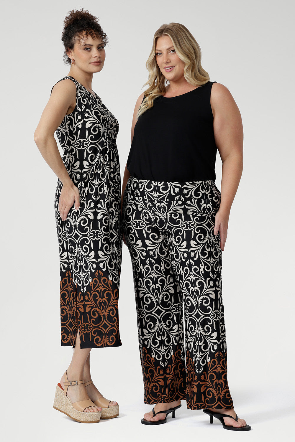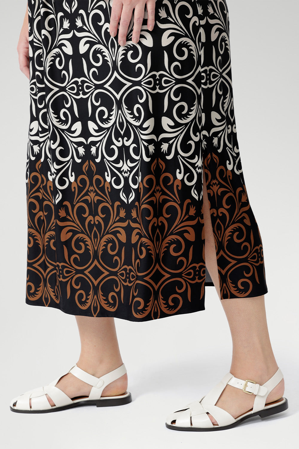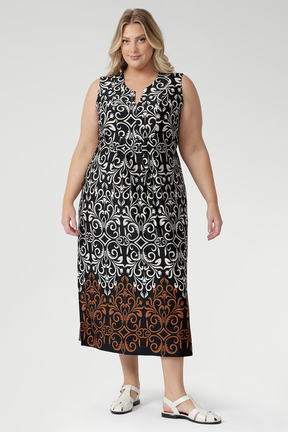 Crafted from slinky stretch jersey, the Fernanda Dress in Borderline features a sleeveless silhouette with waist ties, pleat detailing, and side splits. Showcasing a bronze and ivory placement print on black, this lightweight midi is perfect for summer getaways, evenings, and warm-weather ease.