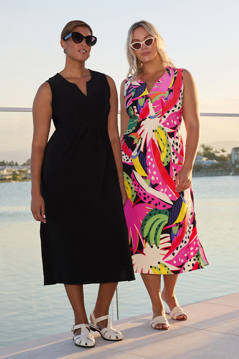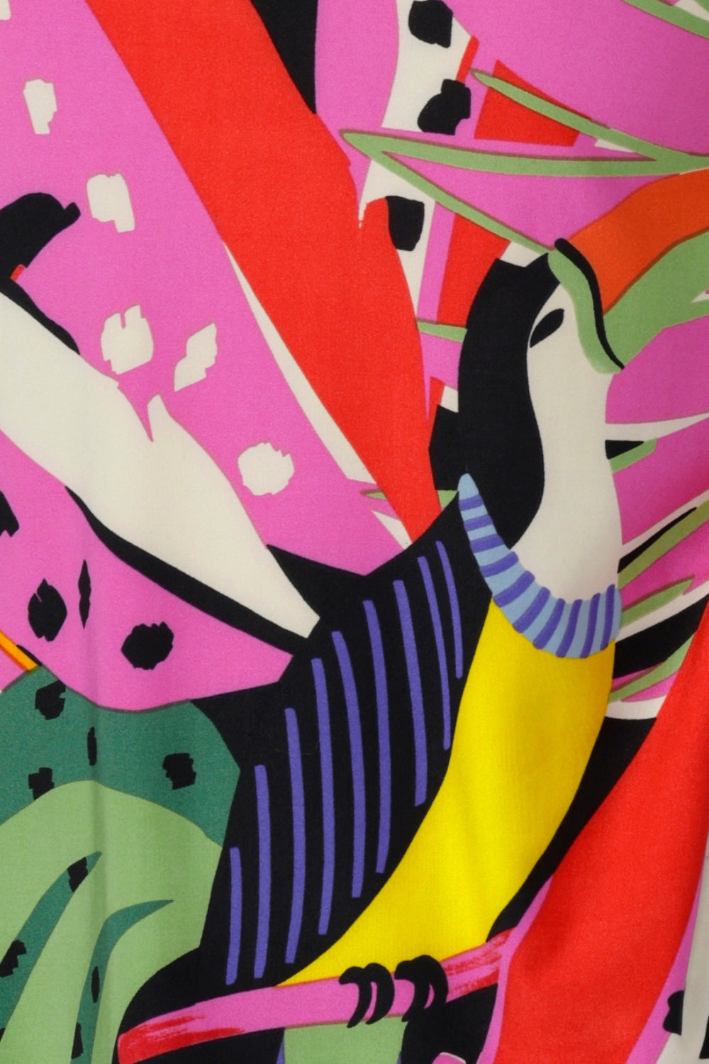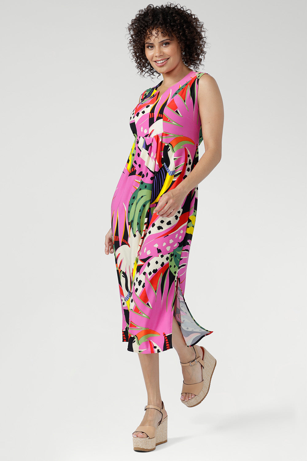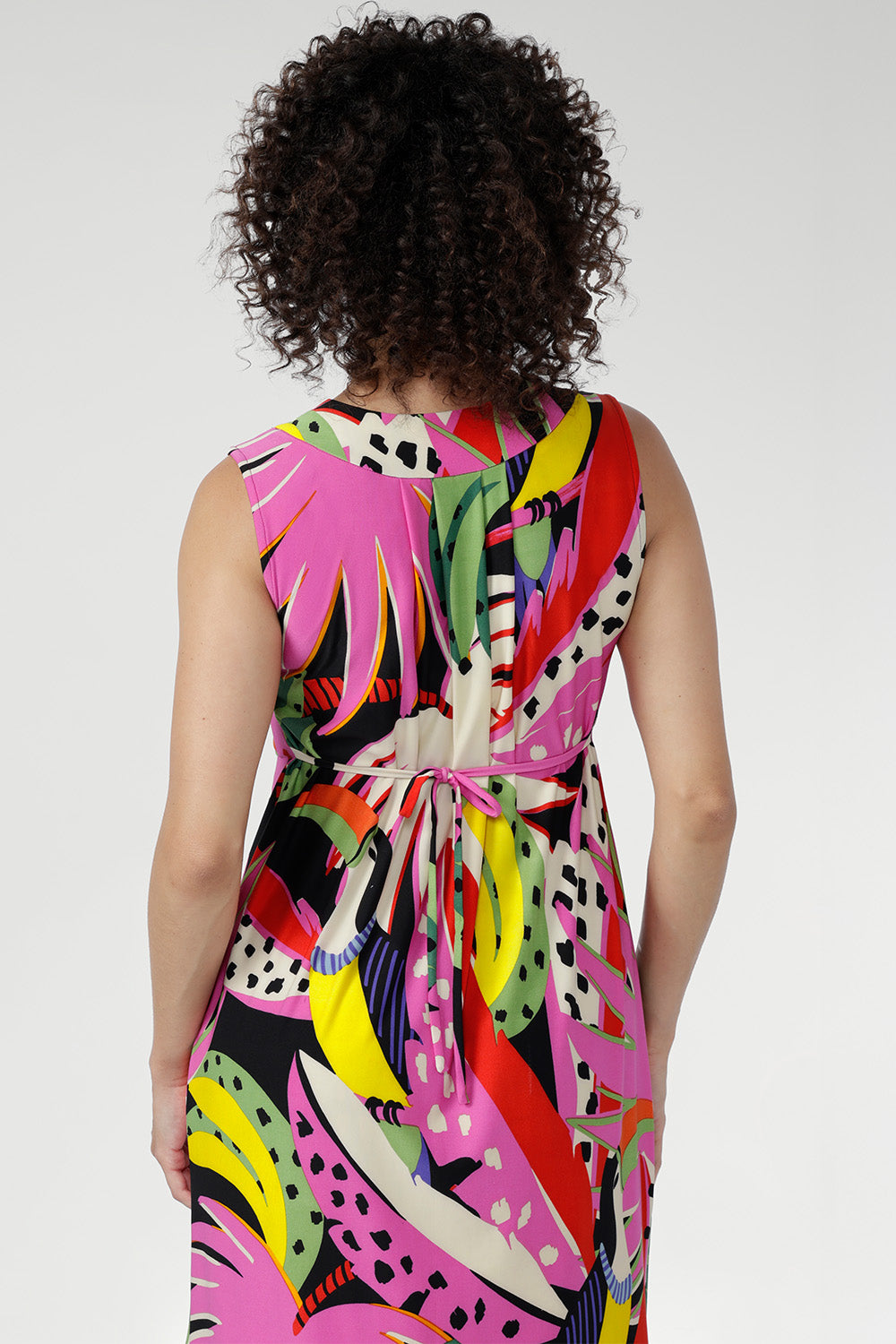 Crafted from soft-touch jersey in an exclusive Toucan print, the Fernanda Dress is an effortless, travel-ready midi for warm-weather events, holidays, and everyday ease. Silky and fluid on the body, it features waist ties and refined pleat detailing for a flattering, feminine shape. The Toucan print blends abstract strokes of pink, red, green, and black on a warm cream base, creating a vibrant, artful statement that enlivens any wardrobe. Wear with sandals or slides for an easy, polished finish. Made in Australia with integrity.
