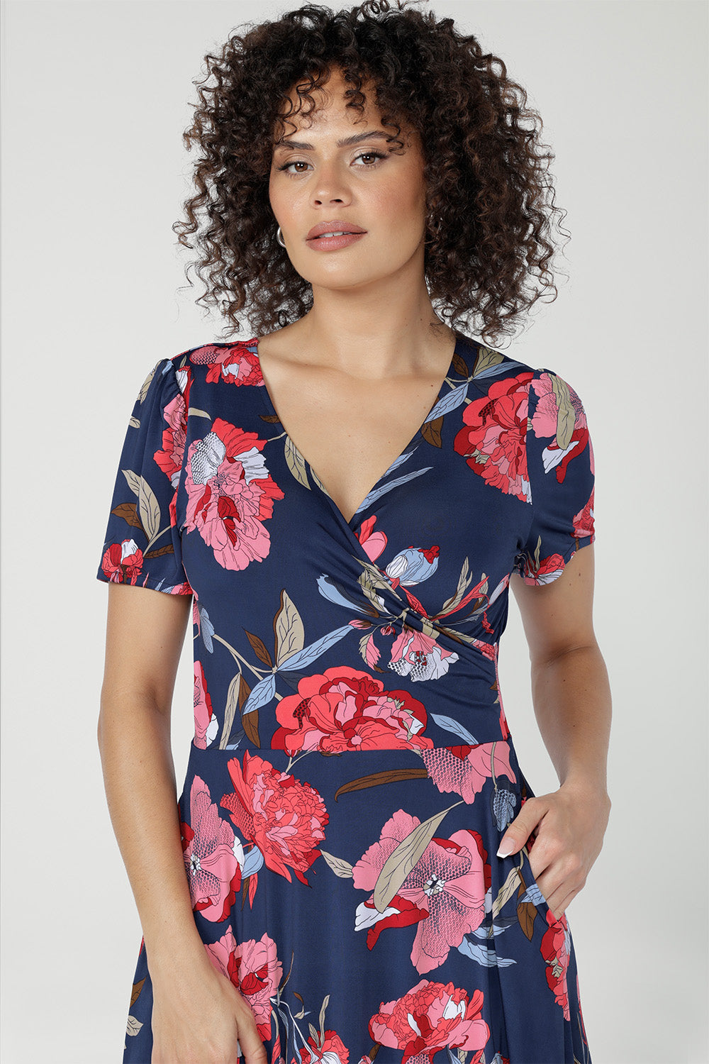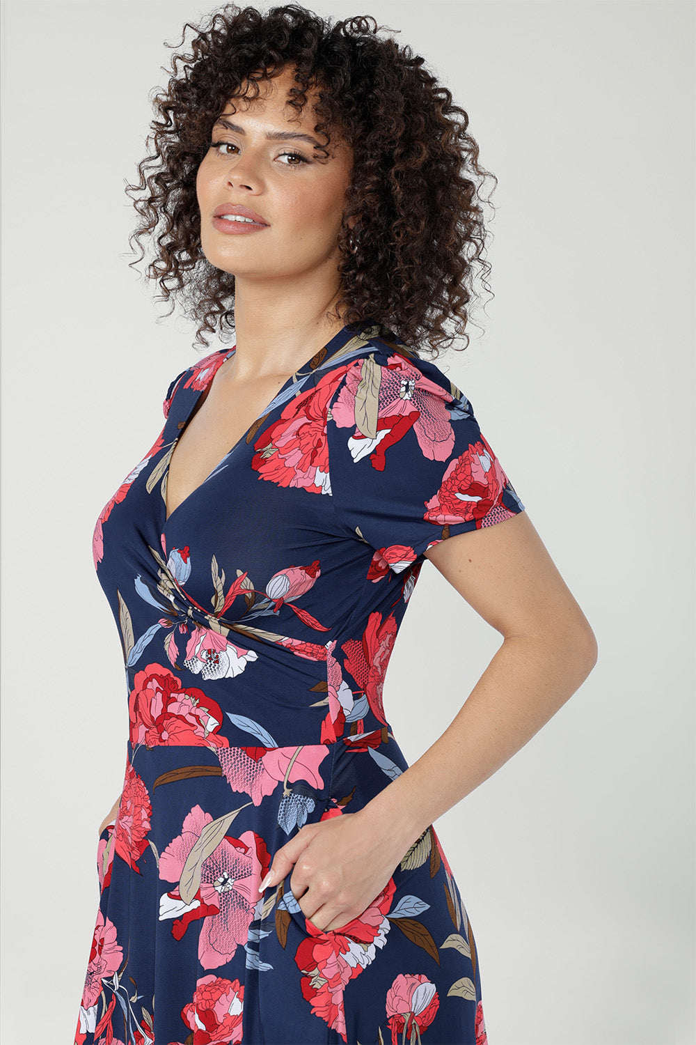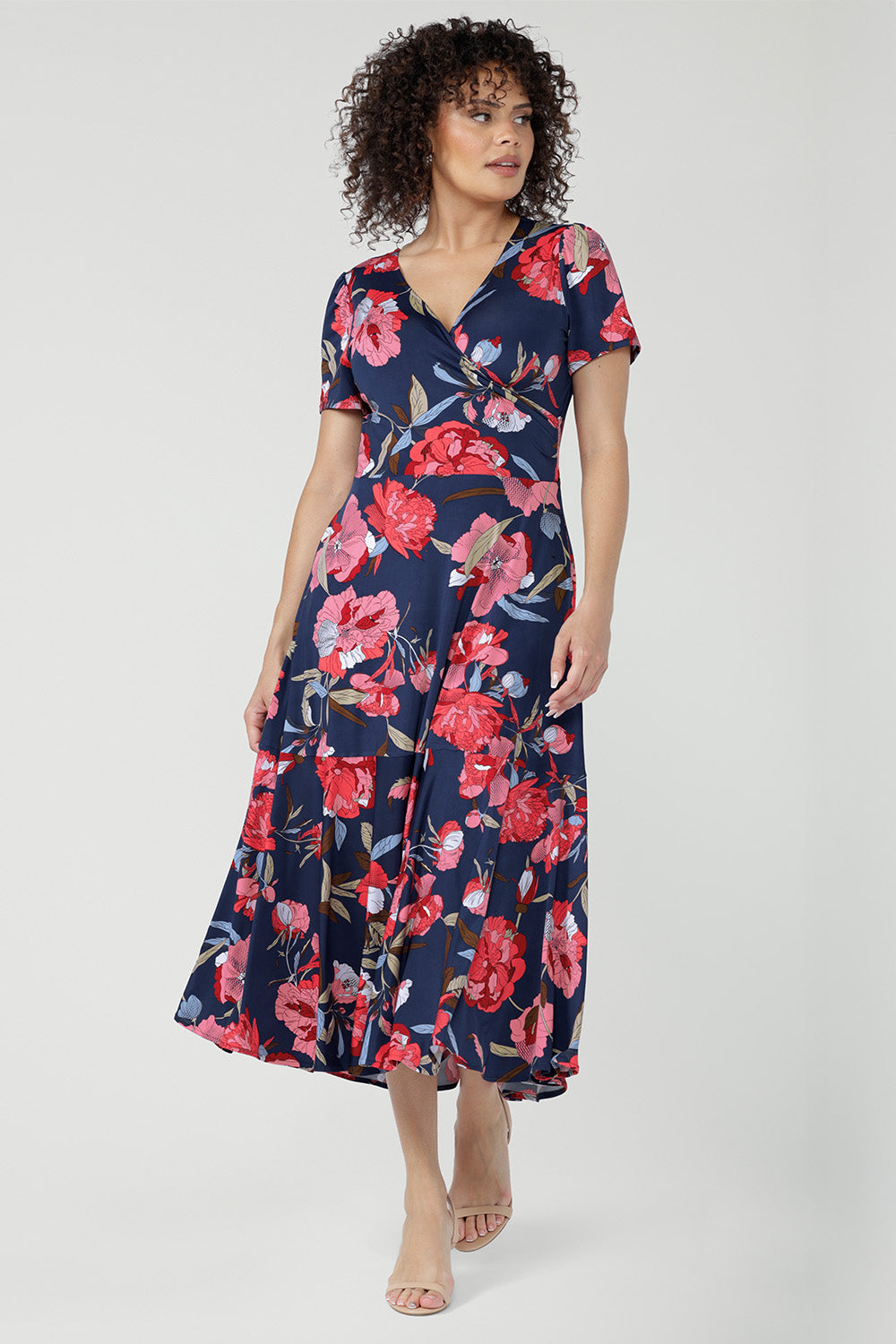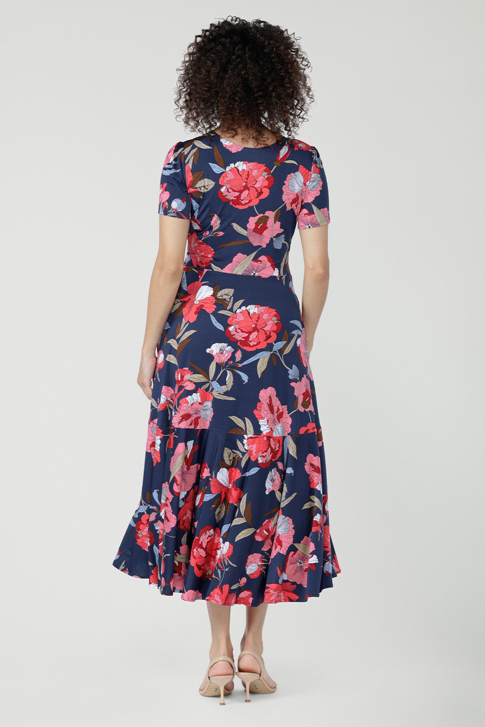 The Mavis Dress in Perfect Peony is a beautifully flattering fixed-wrap midi dress designed for effortless occasion dressing. This easy pull-on style combines comfort and elegance, making it perfect for weddings, garden parties, and special celebrations.