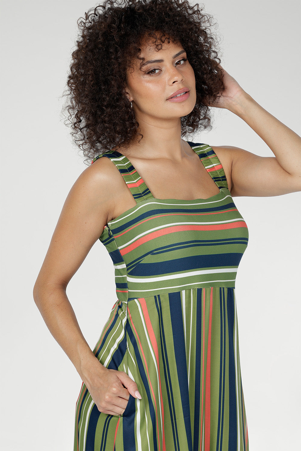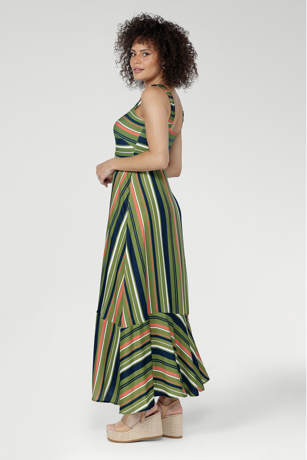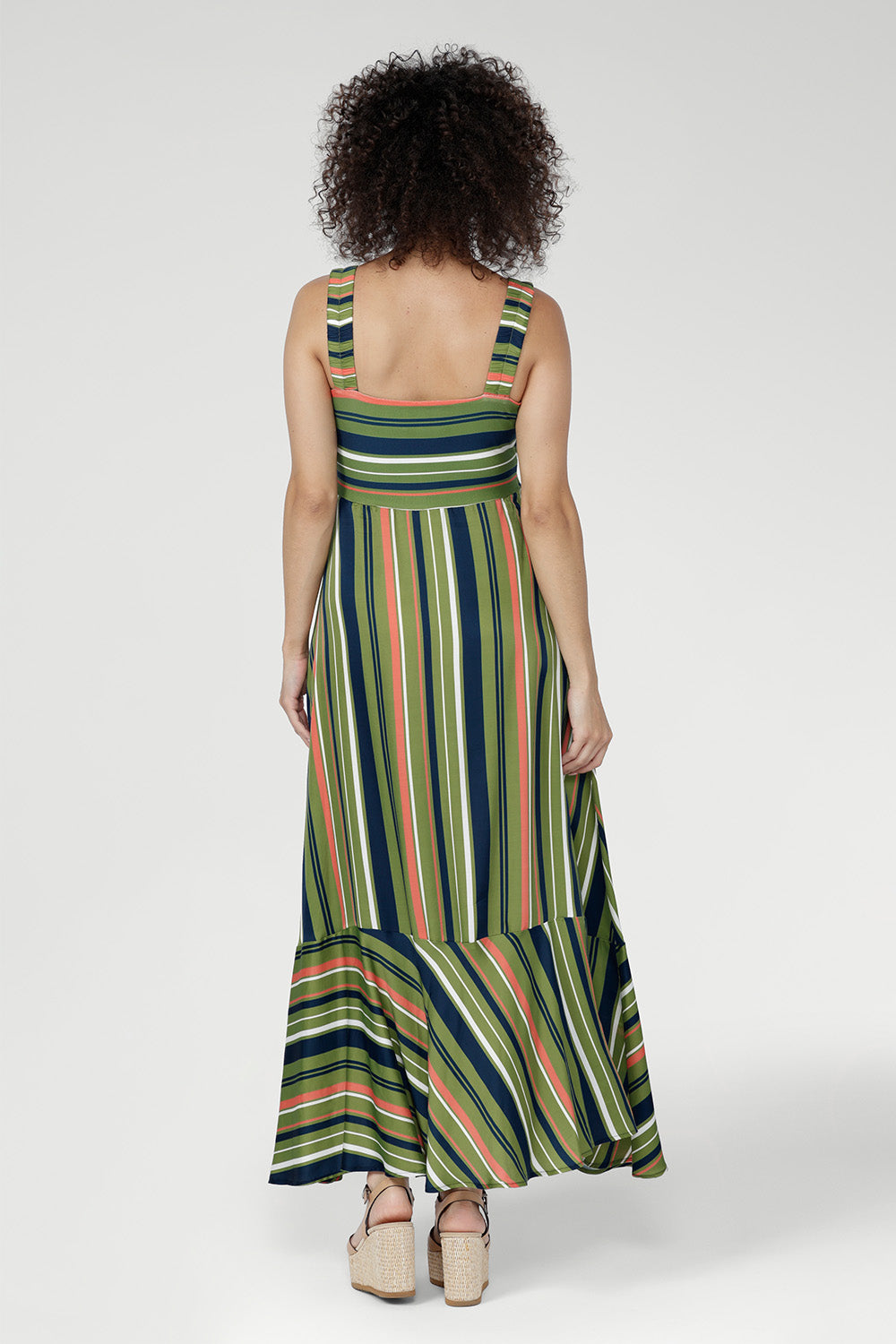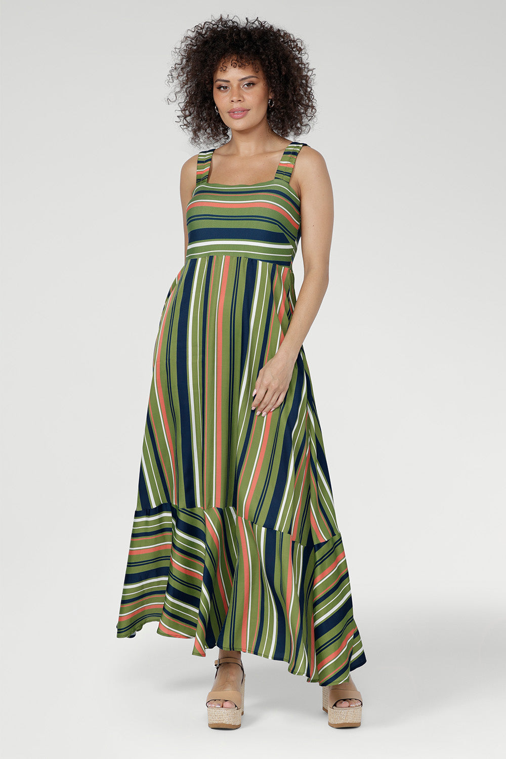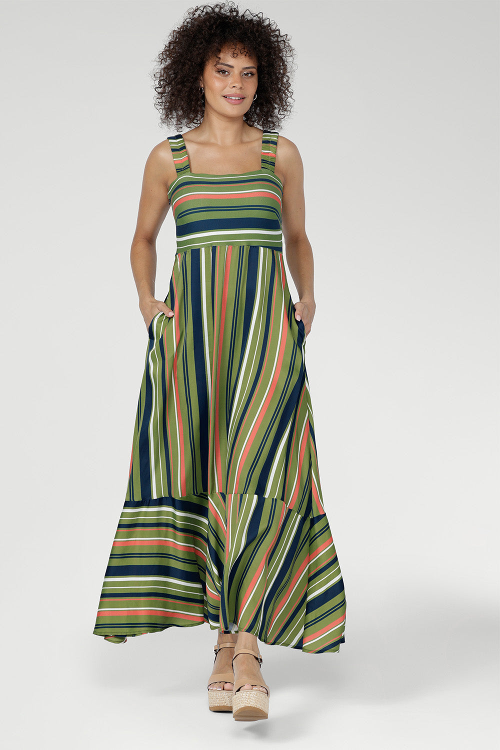 Crafted from Bamboo Jersey and Satin Viscose, the Nitelle Maxi Dress is a flowing summer style with an empire line silhouette. Soft and breathable through the bodice with fluid movement in the skirt, it features wide elasticated straps for comfort. The Green Multi Stripe blends olive, coral, navy and ivory. Made in Australia with integrity.