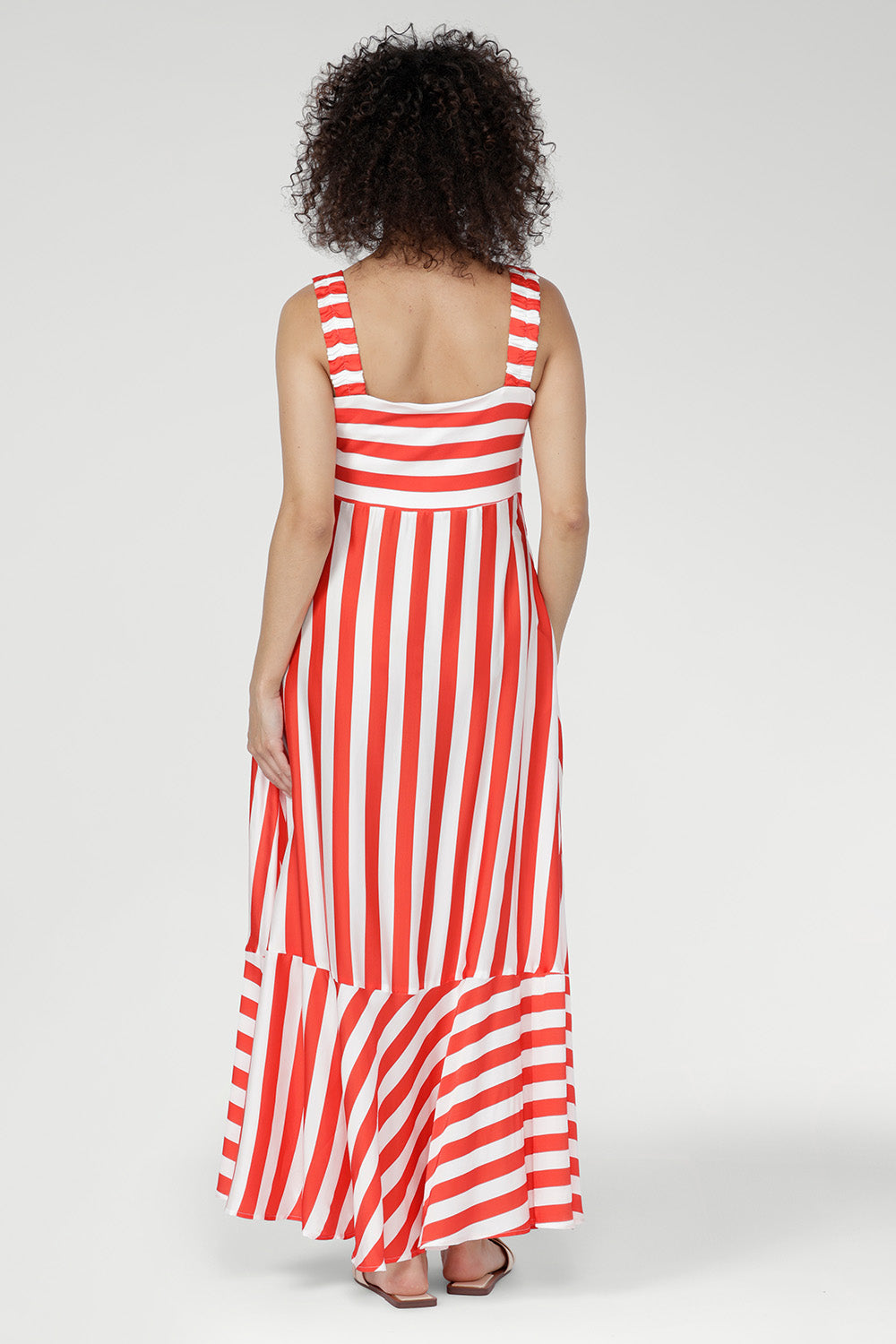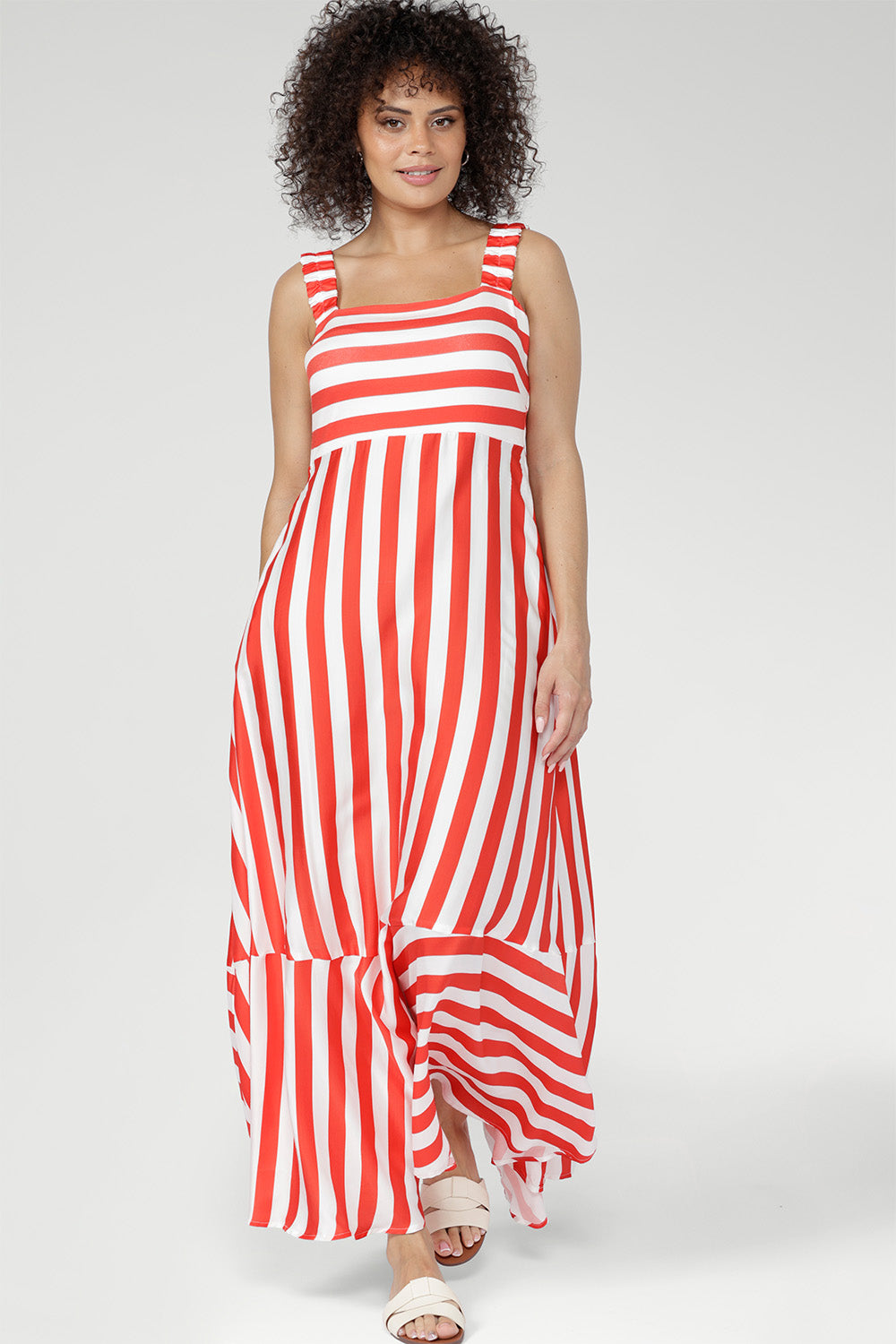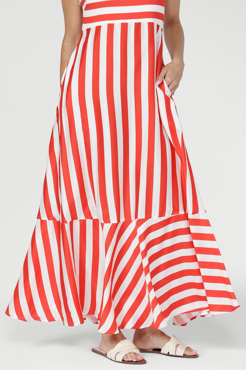 Crafted from Bamboo Jersey and Satin Viscose, the Nitelle Maxi Dress is a flowing summer style with an empire line silhouette. Soft and breathable through the bodice with fluid movement in the skirt, it features wide elasticated straps for comfort. The Tang Stripe blends red and vanilla hues. Made in Australia with integrity.
