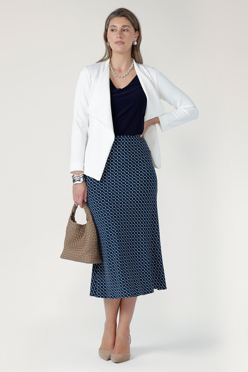 • Bias-cut pull-on skirt with internal elastic at the waist